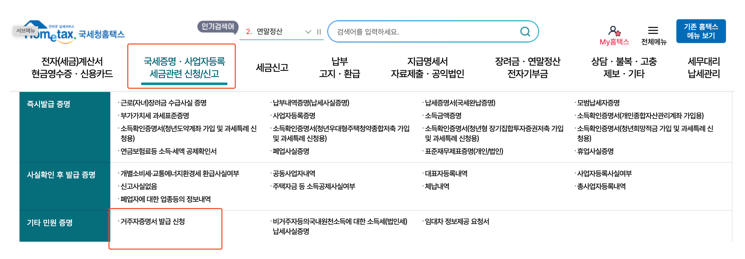 국세증명.사업자등록 세금관련 신청/신고 > 거주자증명서 발급 신청