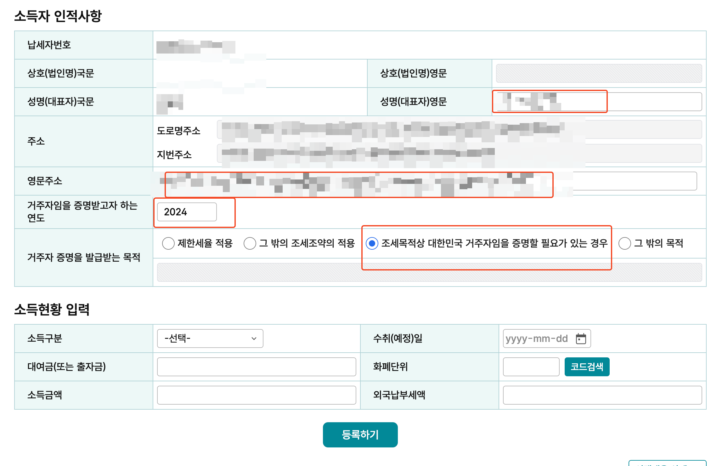 성명(대표자)영문, 영문주소, 거주자임을 증명받고자 하는 연도. 거주자 증명을 발급받는 목적을 기입하고 선택한다.
