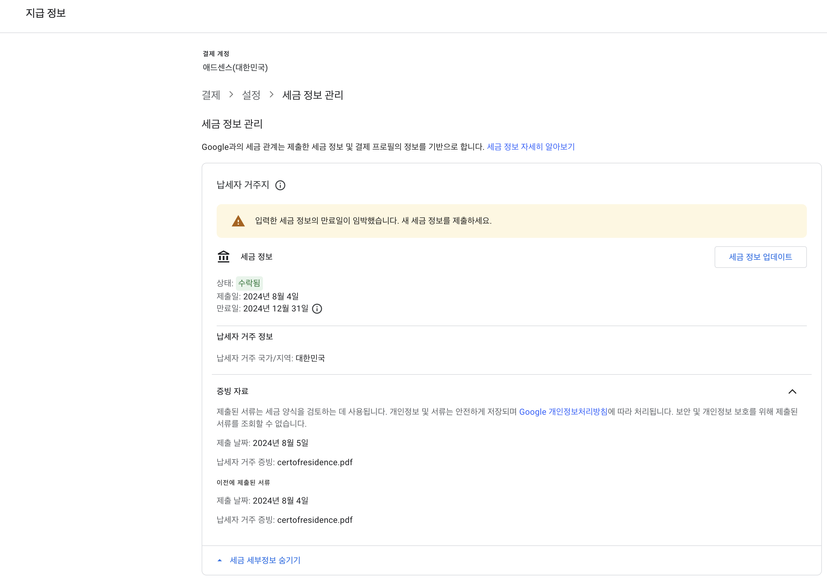 "입력한 세금 정보의 만료일이 임박했습니다. 새 세금 정보를 제출하세요."