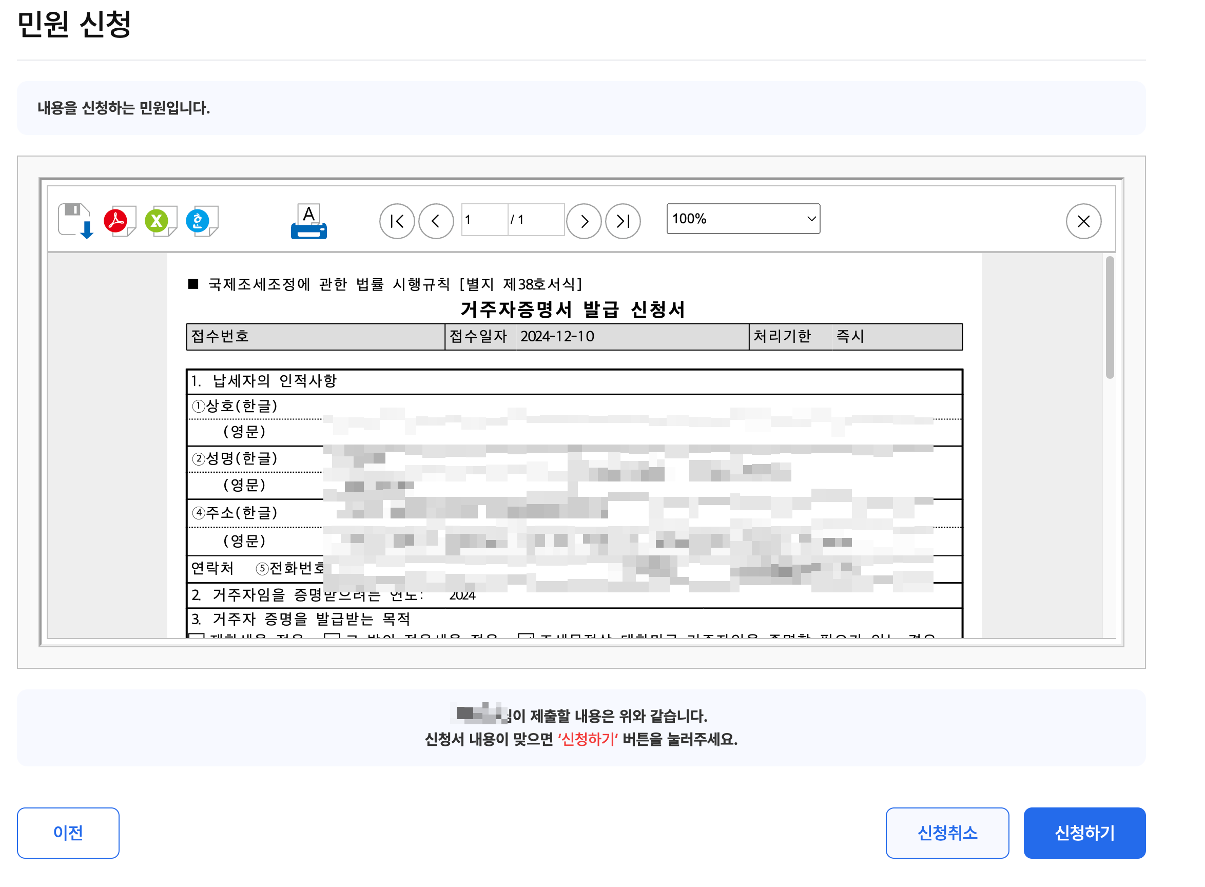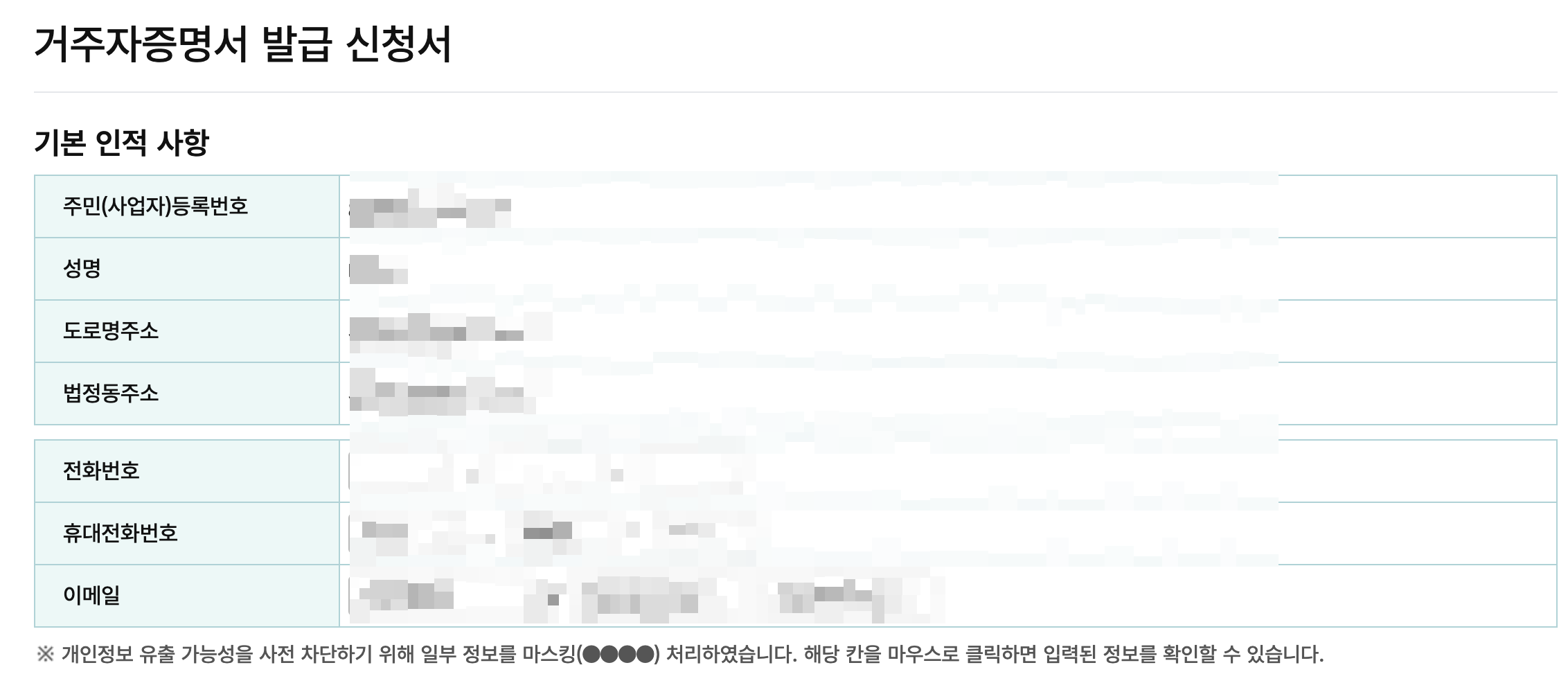 거주자증명서 발급 신청서의 기본 인적 사항을 확인할 수 있다.