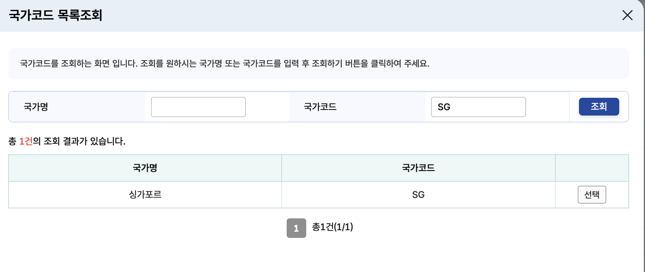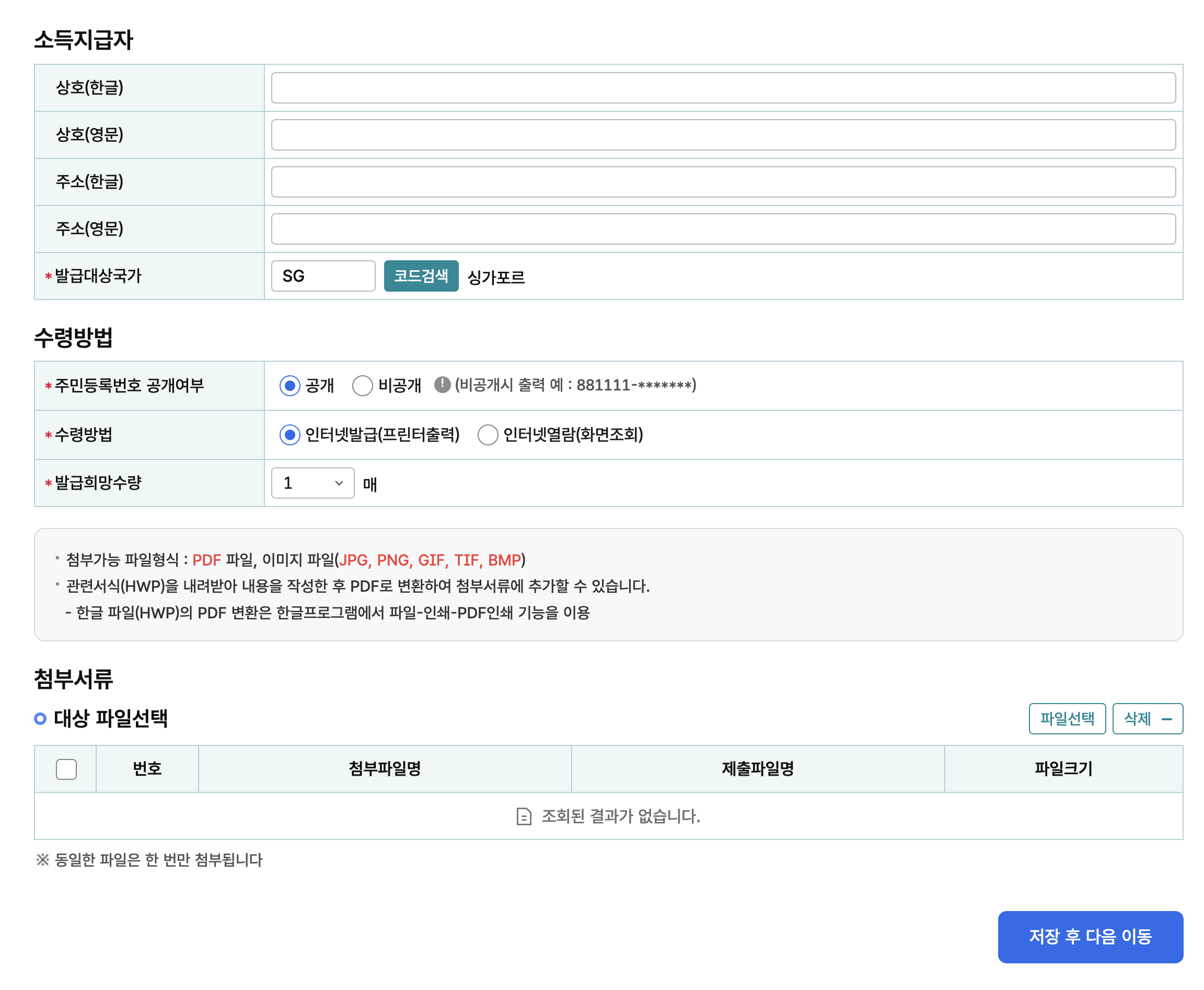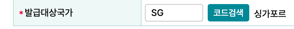 소득지급자에 발급대상국가가 있는데 'SG' 코드검색을 해서 싱가포르를 선택한다.