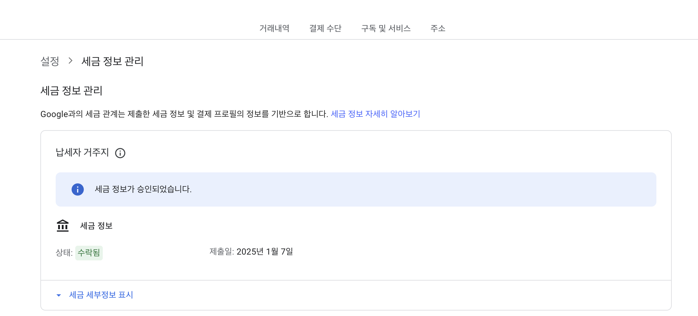 아래처럼 "세금 정보가 승인되었습니다." 메시지가 보이면 정상적으로 세금 정보 업데이트가 완료되었습니다!