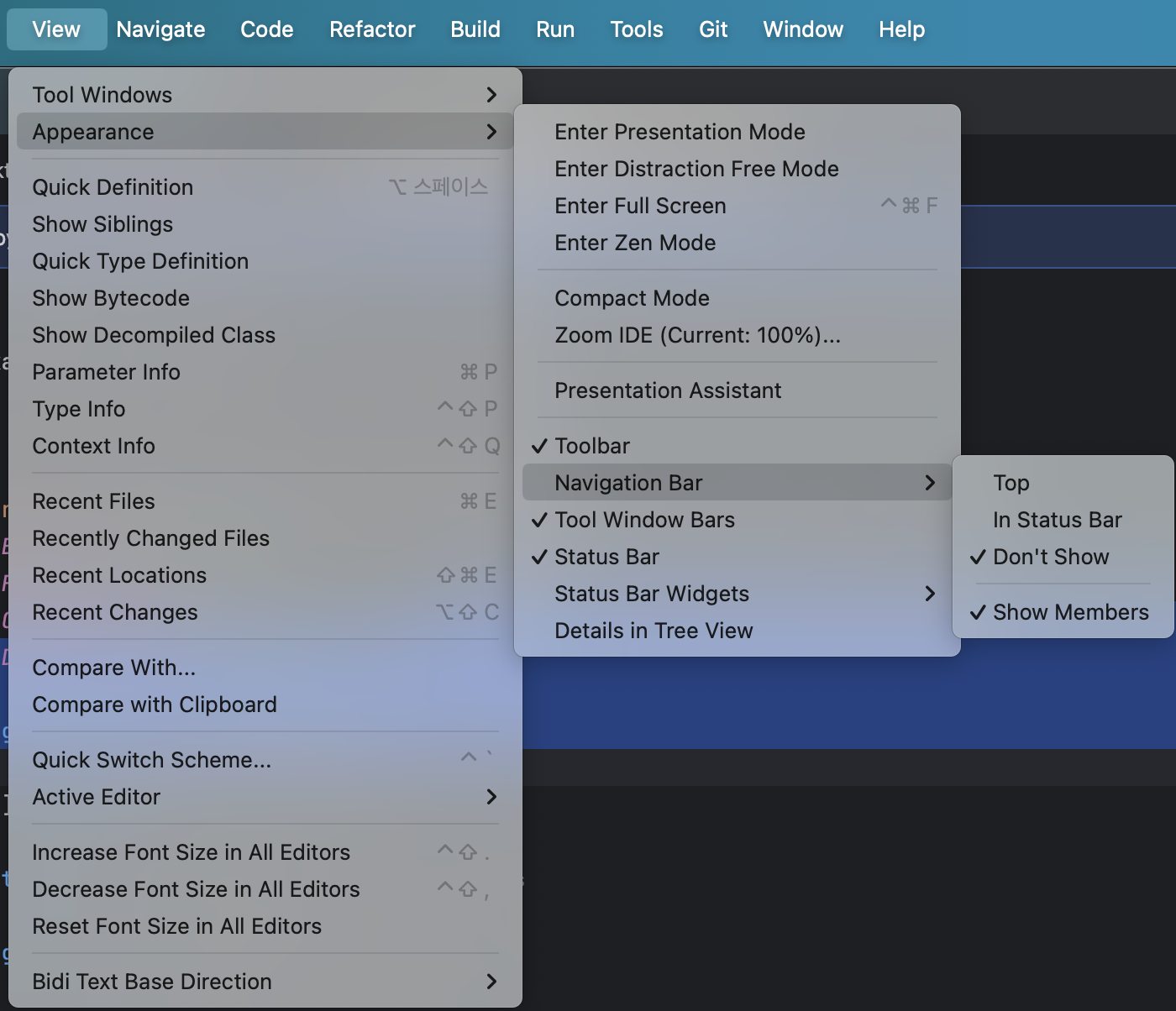 View > Appearance > Navigator Bar > In Status Bar 로 변경한다.