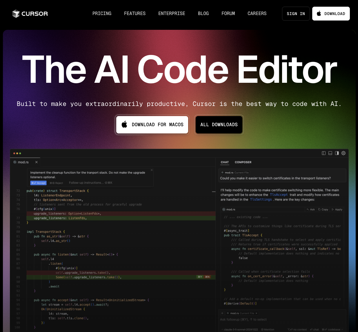 - 'AI 커서'를 통해 코드의 어느 위치에서든 자연어 명령으로 코드를 수정할 수 있습니다.