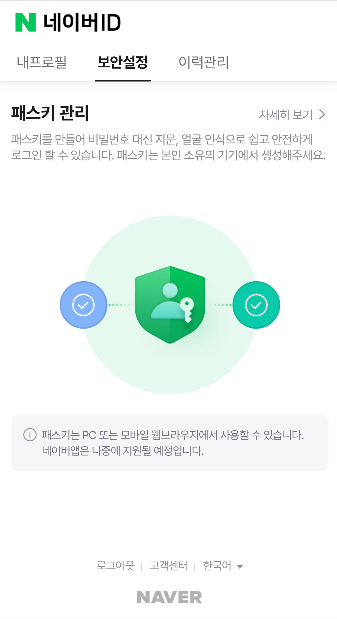 패스키 로그인은 PC와 모바일웹에 우선 적용되었으며, 네이버앱에는 추후 적용될 예정이라고 합니다.