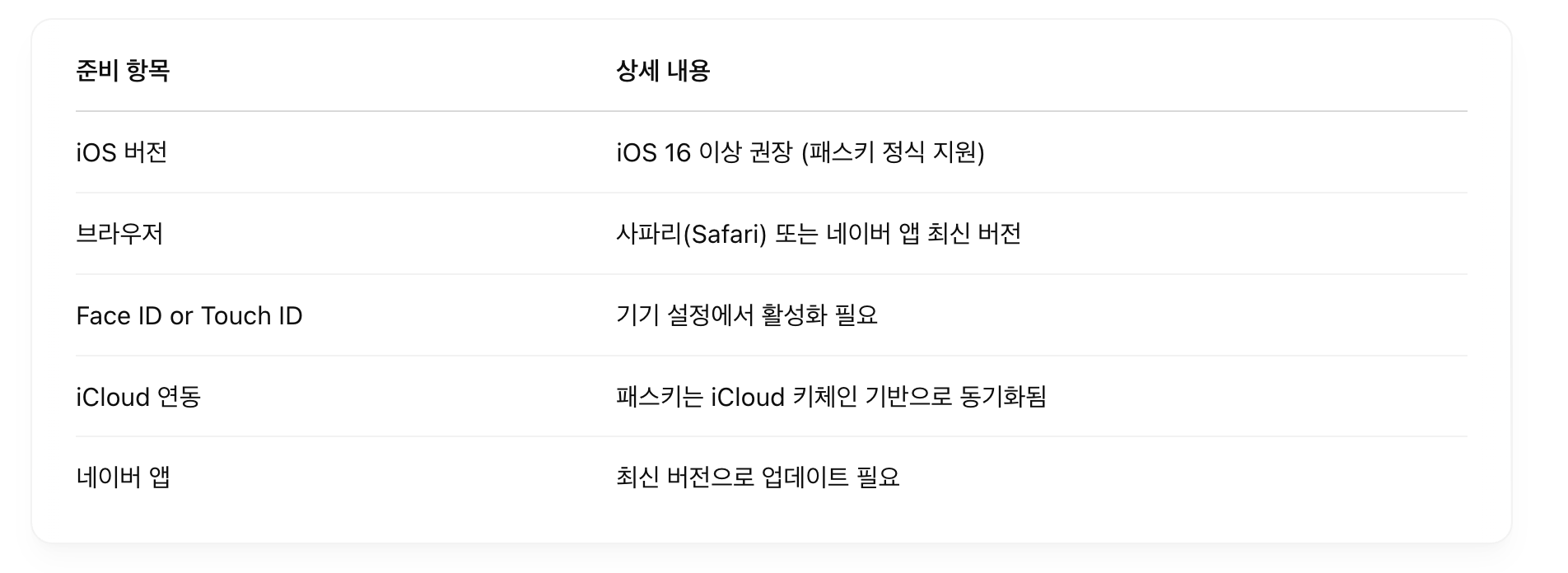 | 패스키 등록 불가 | iOS 또는 네이버 앱 구버전 | 최신 버전으로 업데이트 |