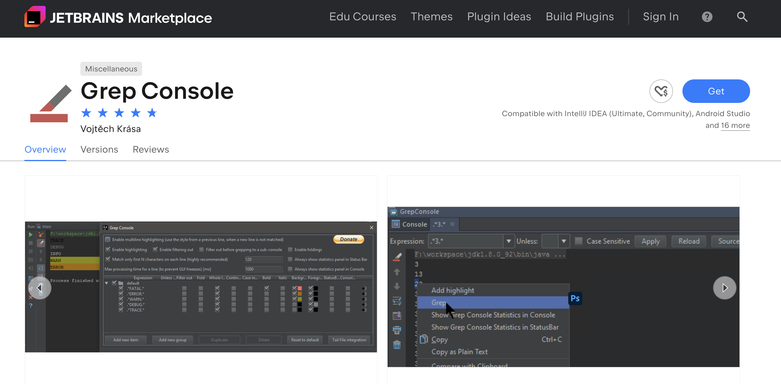 상단 탭에서 'Marketplace'를 클릭한 후 검색창에 Grep Console을 입력합니다. 빨간색과 녹색이 섞인 아이콘(제작자: Vojtech Krasa)이 보일 거예요. [Install] 버튼을 누르고 설치가 완료되면 인텔리제이를 재시작(Restart IDE) 해주세요. 이것으로 준비는 끝났습니다.