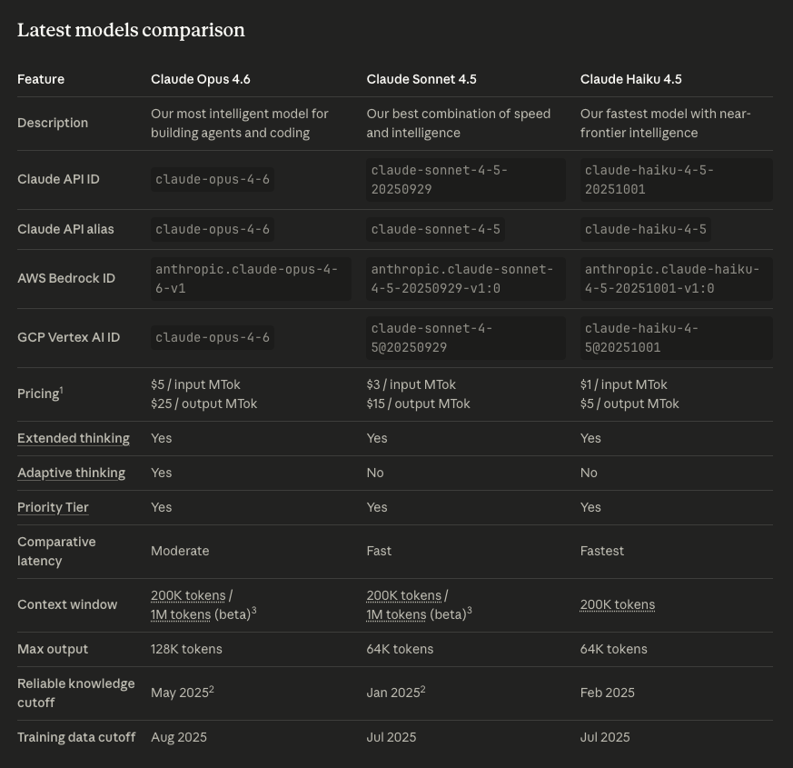 Anthropic은 현재 Claude Opus 4.6, Opus 4.5, Sonnet 4.5, Haiku 4.5 네 가지 최신 모델을 제공하며,