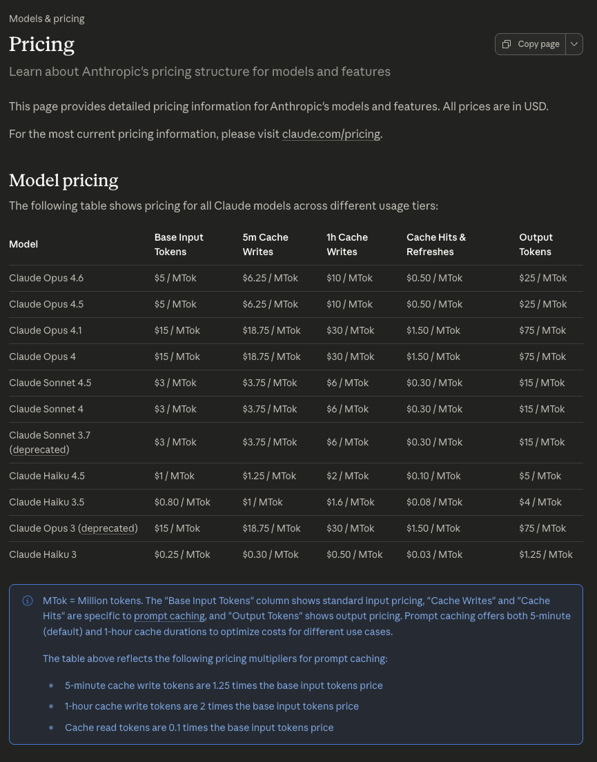 | Opus 4.6 | $5 / MTok | $25 / MTok | $6.25 / MTok | $0.50 / MTok |
