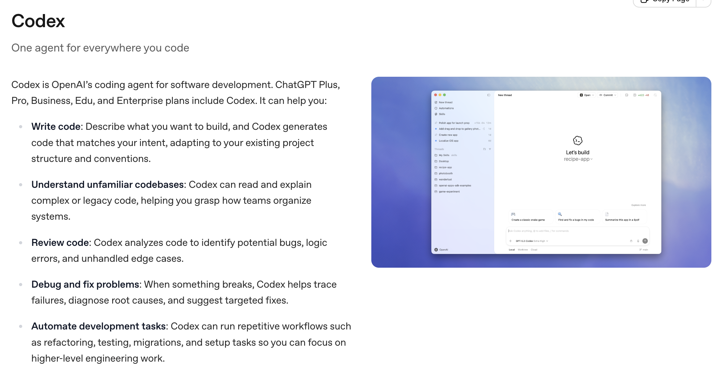 - Codex는 OpenAI가 만든 에이전틱(agentic) 코딩 에이전트입니다. 터미널(CLI), IDE 확장, 웹 클라우드, 심지어 모바일에서도 사용할 수 있으며, 코드 작성·리뷰·디버깅·리팩토링 등 소프트웨어 엔지니어링의 거의 모든 영역을 커버합니다.