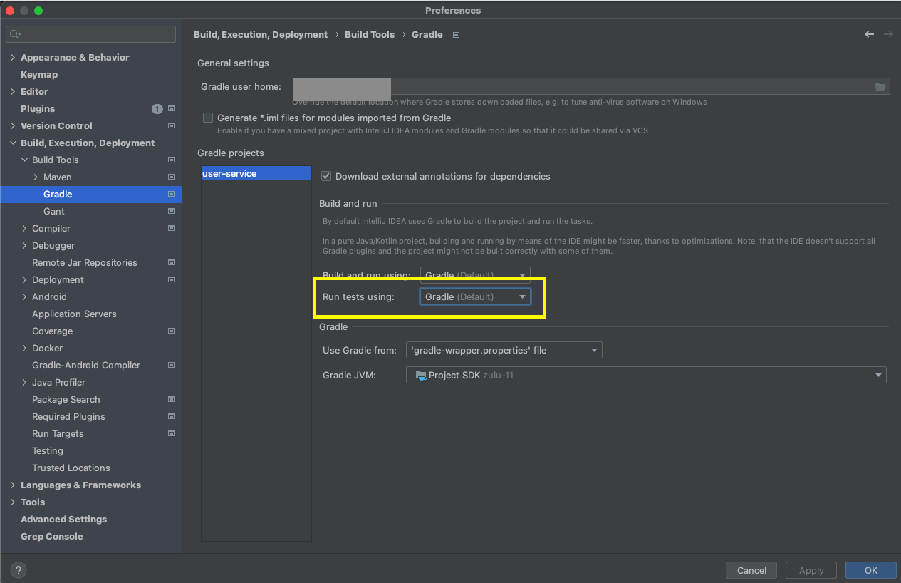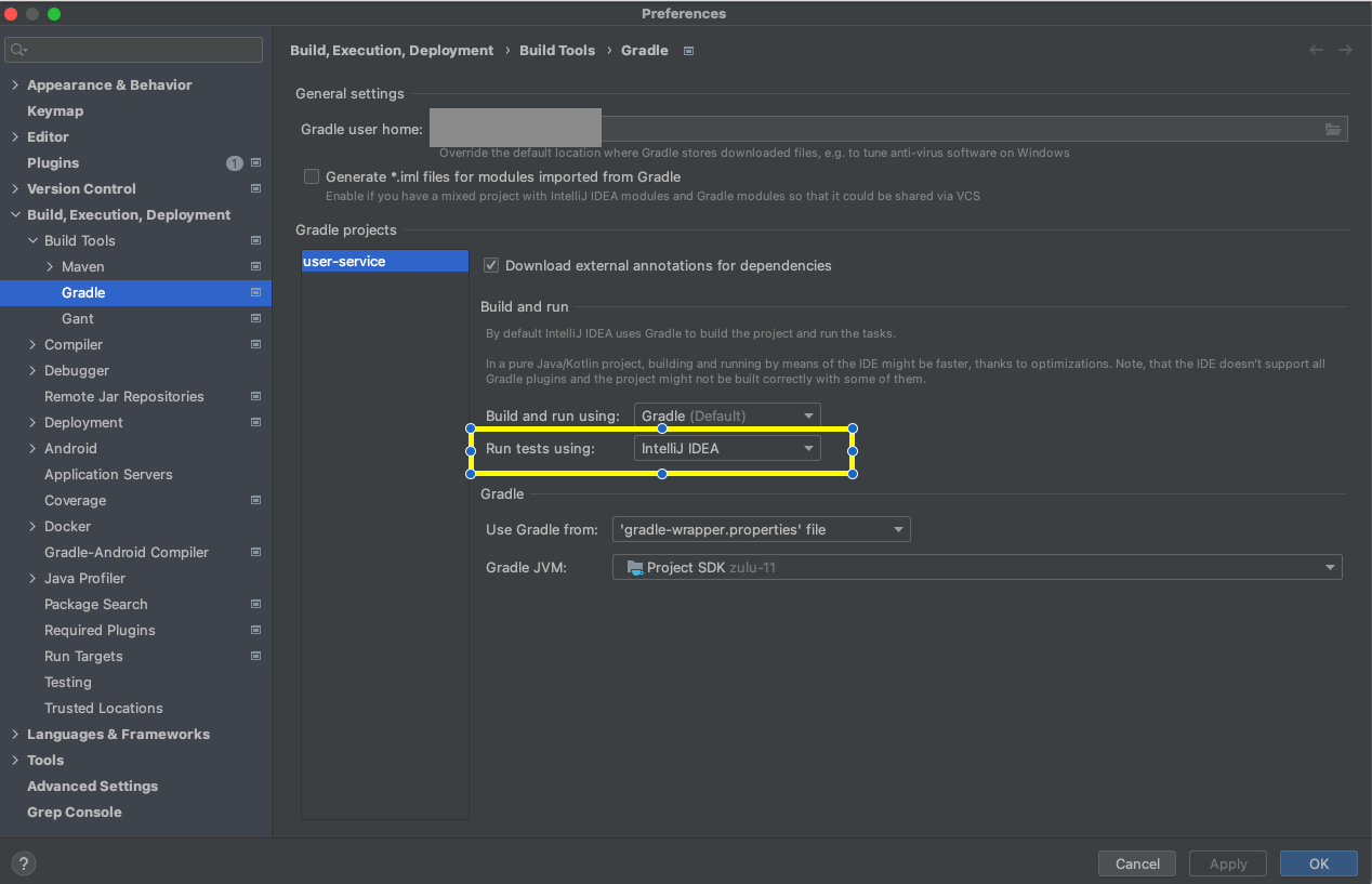 IntelliJ > Preferences > Build, Execution, Deployment > Build Tools > Gradle 설정을 보면,