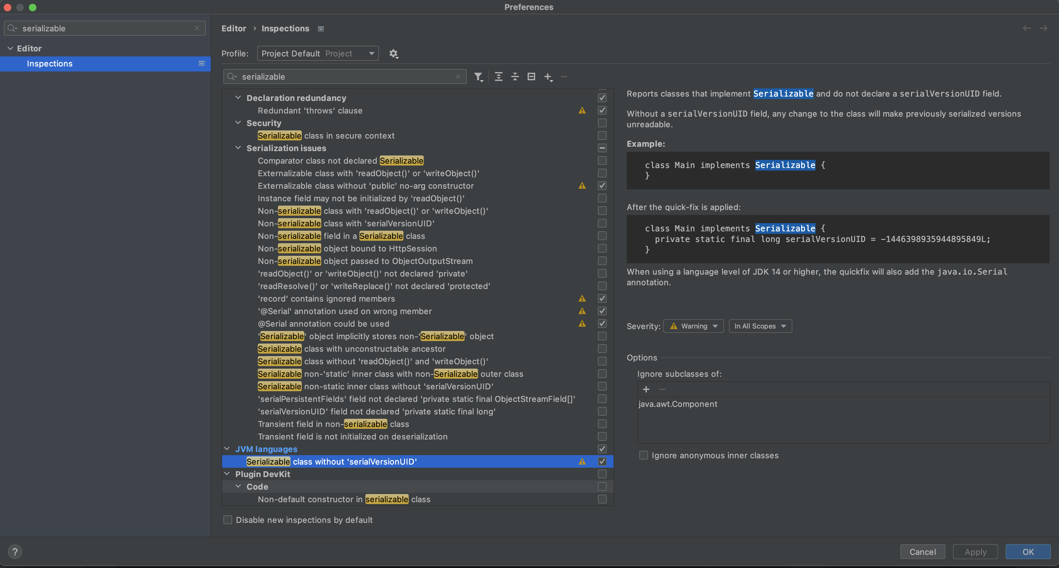 검색창에 "serialization"을 쳐보면 Editor > Inspections > JVM languages 를 확인할 수 있습니다.