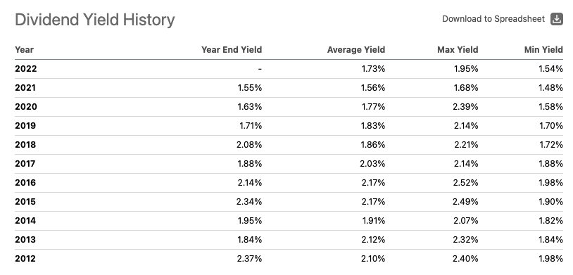 최근 10년동안의 배당 히스토리입니다. 10년동안 2%를 넘은 적이 많지는 않네요.