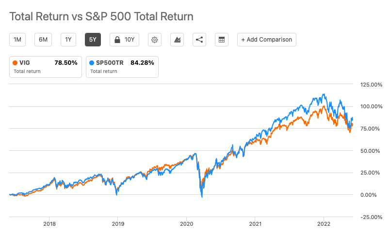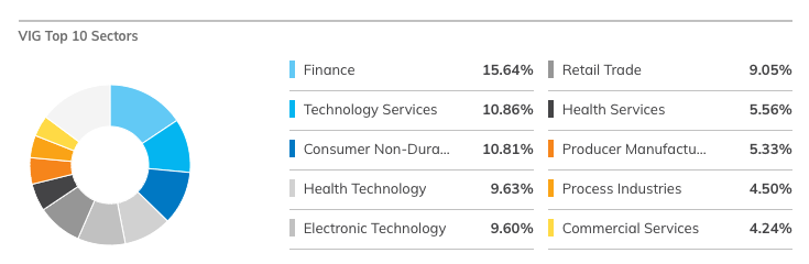 VIG는 10년 이상 연속으로 연간 배당금을 인상한 미국 기업의 시가총액 가중 지수를 추적합니다.