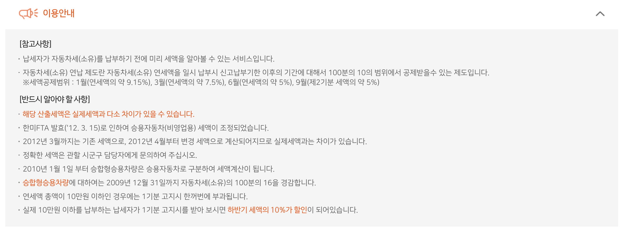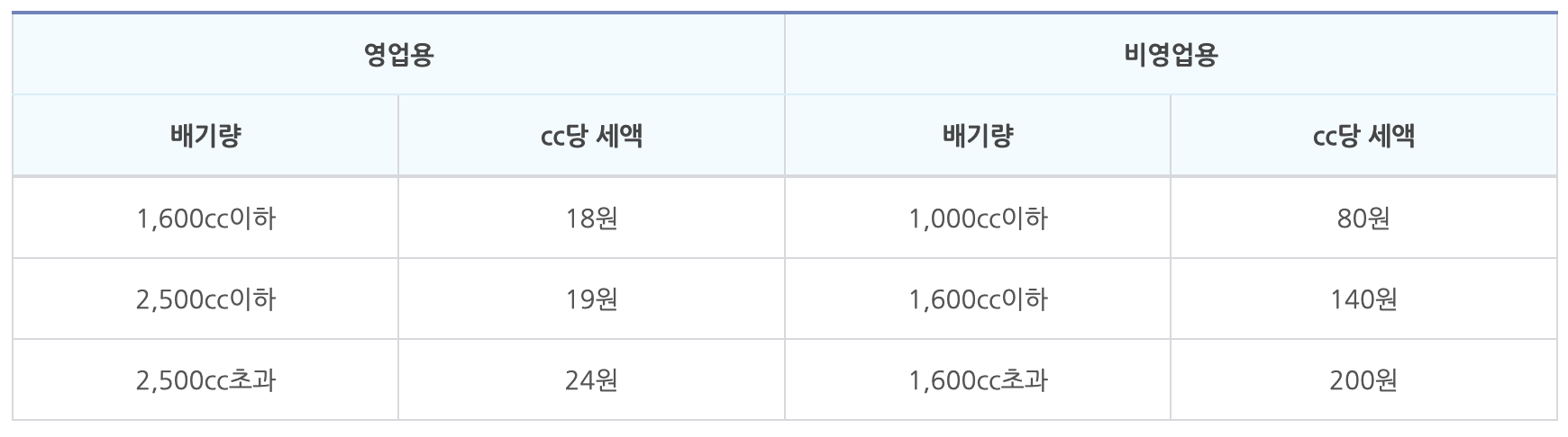 - 배기량에 CC당 세액을 곱하여 산출한 세액에 차령별 감가상각율을 곱하여 산출된 세액을 1대당 연세액으로 합니다.